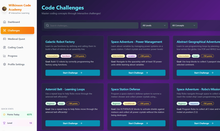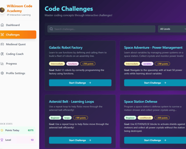 The Wilkinson Code Academy is a gamified educational platform designed to make learning to code accessible, engaging, and effective for young students. Its purpose is to build a connected learning ecosystem that supports not just the child but also their teachers and parents. For students, it transforms complex programming concepts into interactive, game-like challenges where they can earn points and track their progress. For teachers, it provides a powerful classroom management dashboard to assign specific lessons, monitor student comprehension at a glance, and identify who needs help. Meanwhile, parents can link their accounts to view their child's achievements, creating a supportive and informed loop that encourages a child's educational journey.